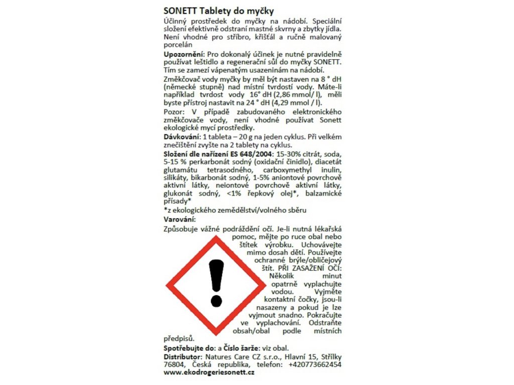 Důležité upozornění: Vhodné pouze pro myčky nádobí s nastavitelným změkčením vody. Pokud stroj neumožňuje ruční nastavení, není možné používat Sonett mycí prostředky do myček.