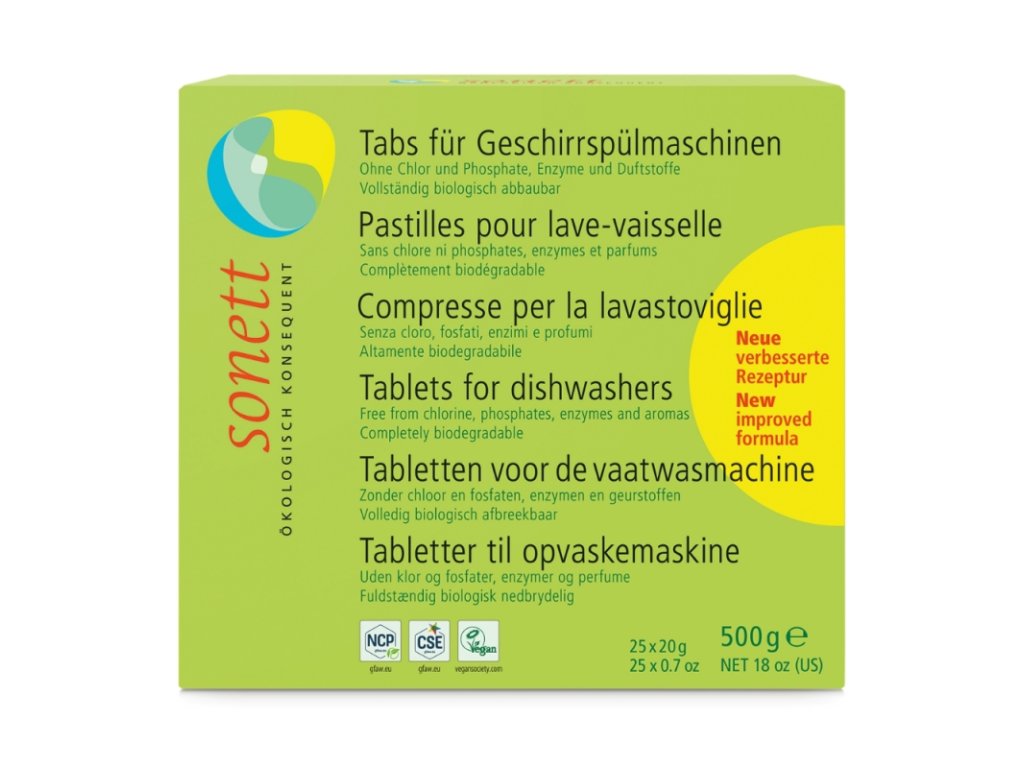Zvláštnosti produktu: Tablety SONETT obsahují nerostné látky a biologicky plně odbouratelné organické složky. Neobsahují enzymy, agresivní bělicí látky s obsahem chloru, fosfáty ani vonné látky.